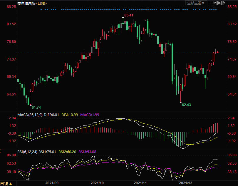 日线级别:油价四连涨后周二持稳,尽管Omicron毒株比较温和,但其扩散速度令人担忧。