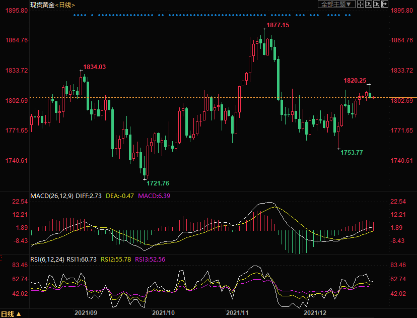 日线级别:金价周二冲高回落,留下长上影,显示1820附近抛压较大。
