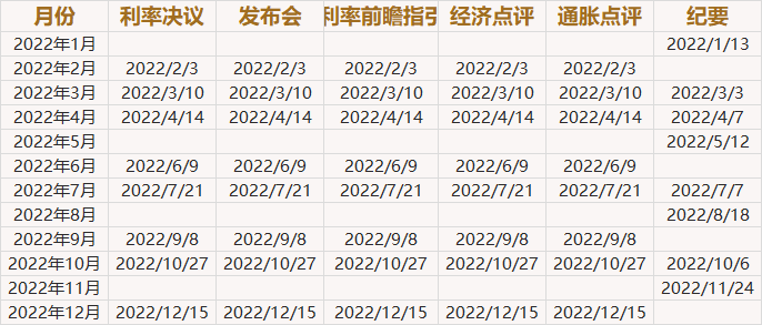 快收藏!2022年全球八大央行利率决议和纪要日程一览