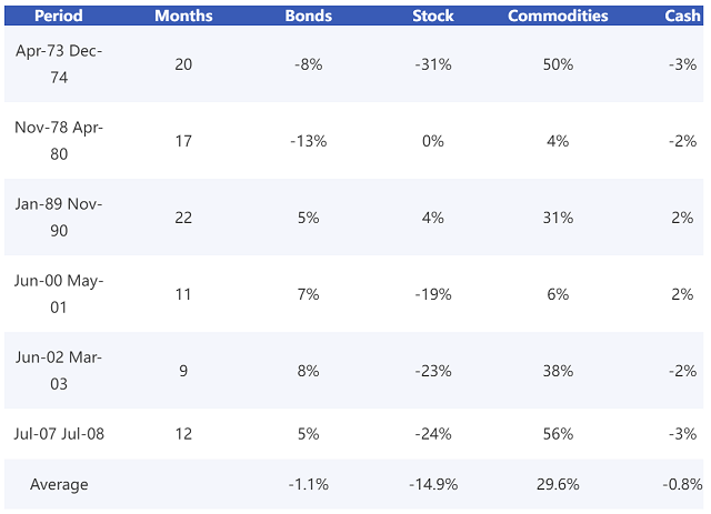 让我们来看看美国市场的情况,在经历了40年后,通货膨胀又开始抬头了:下表显示了美国的六个滞胀时期,即通货膨胀高,而产出收缩或停滞。可以看出,除大宗商品外,所有资产类别在这些阶段都亏损了。在大宗商品中,贵金属表现往往更加亮眼。