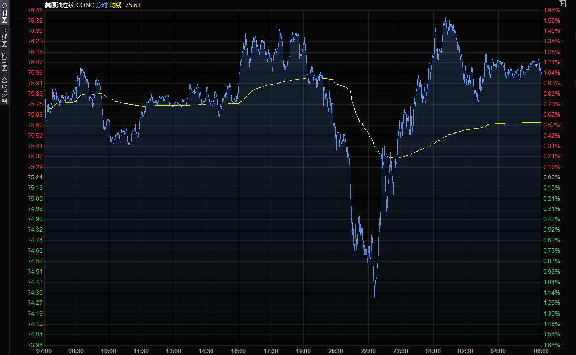 布伦特原油期货LCOc1结算价上涨1.20美元,报每桶78.98美元,涨幅1.5%;美国原油期货(WTI)结算价上涨0.87美元,报每桶76.08美元。