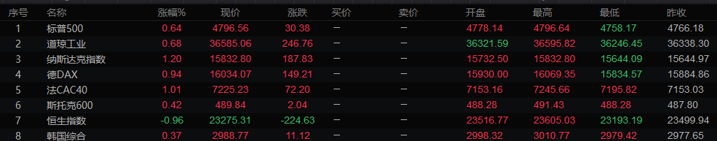 美国股市方面,标普500指数上涨0.6%,报4796.56点;道琼斯工业平均指数上涨0.7%,报36585.06点;纳斯达克综合指数上涨1.2%,报15832.8点。