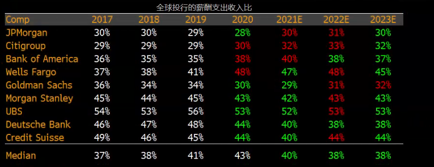 得益于业务结构调整,高盛的薪酬支出收入比可能将低于历史水平。花旗和美国银行等利息收入占比较大的银行,2021年的薪酬支出收入比将有所上升(与2020年类似),不过成本增速放缓以及利率上升应有助于美国银行降低2022年的薪酬支出收入比。而德意志银行正在经历重组,其薪酬支出收入比明年也有望下降。
