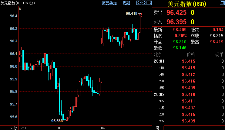 北京时间20:02,现货黄金上涨0.18%至1804.74美元/盎司;COMEX期金主力合约上涨0.25%至1804.6美元/盎司;美元指数上涨0.18%至96.407。