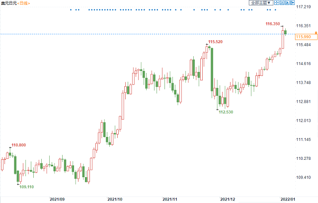 本周多种支撑因素共同推动美元兑日元创下五年新高。奥密克戎危机的消退削弱了作为避风港的日元,并对该货币对起到了推动作用。同时飙升的美国债券收益率令美元受益,并继续支撑美元的强劲走高。周三(1月5日)欧市盘前,随着10年期美债收益率及美元走软,美元兑日元小幅回落,目前投资者正等待美国经济数据及FOMC会议纪要带来新的推动力。