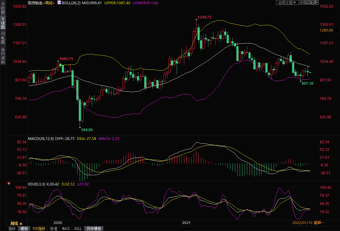 2021年对整个贵金属行业来说都是惨淡的一年,铂族金属(PGMs)也是如此,现货铂金在一季度跟随金银跌势,一度跌至697.39美元/盎司,但随后跟随其他大宗商品涨势,最高触及1339.73美元/盎司,较2020年收盘价上涨近25%,但随后受到美元走强等因素的压制,2021年底最终收报968.74,年度跌幅约9.63%。