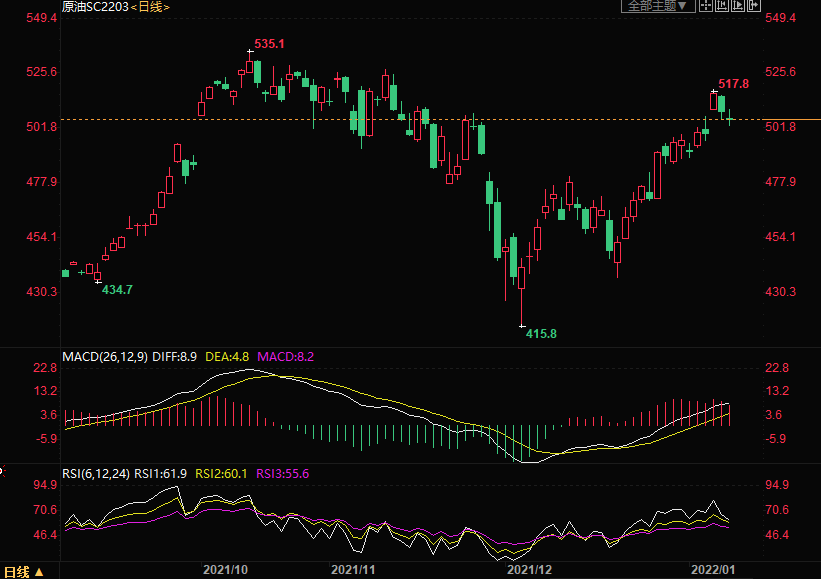 上海原油价格下跌0.8%,主力合约2203终盘收于505.9元/桶,跌4.1元/桶。