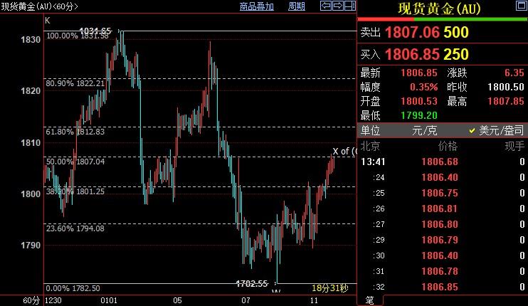 北京时间13:42,现货黄金上涨0.32%至1807.38美元/盎司;COMEX期金主力合约上涨0.43%至1806.5美元/盎司;美元指数下跌0.13%至95.837。