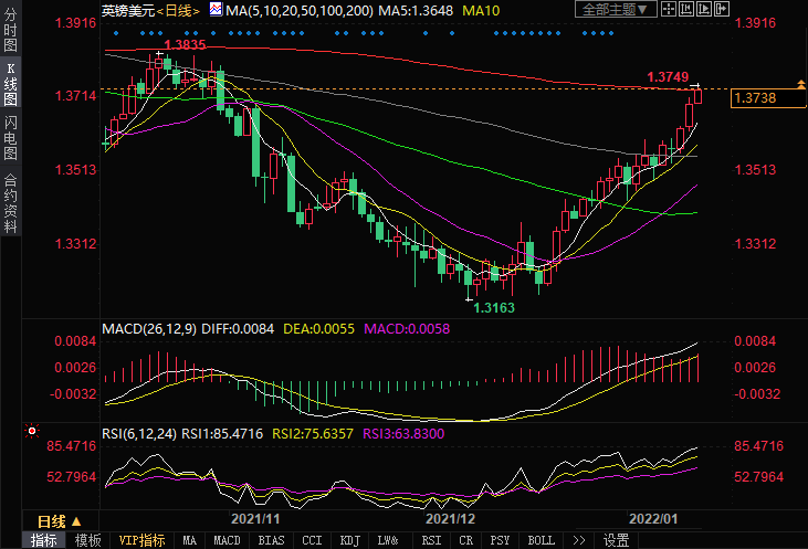周四(1月13日)英镑兑美元维持看涨势头,并创下两个半月新高。该货币对暂时无法突破1.3750,目前维持在200日移动均线切入位1.3736附近。