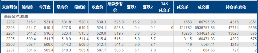 上海原油价格上涨1.83%,创两个月新高,主力合约2203终盘收于524.1元/桶,涨9.4元/桶。