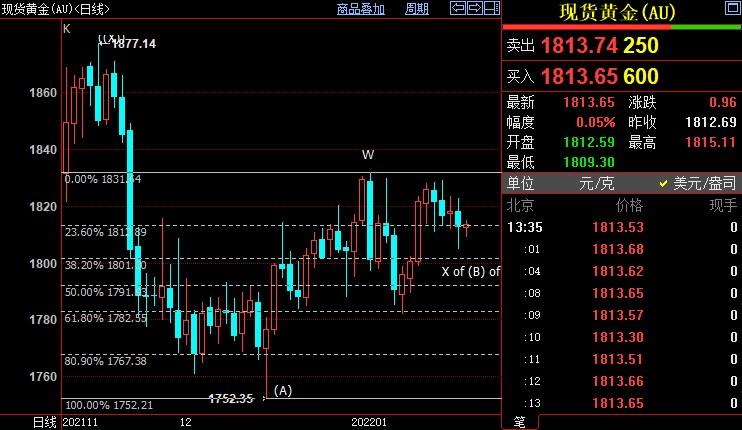 日线上看,金价处于自1832美元开启的调整X浪,目前交投在W浪23.6%斐波那契回档位1813美元附近,后市料下探38.2%斐波那契回档位1801美元。X浪和W浪都是自1752美元开启的上行(B)浪的子浪。(B)浪是自1877美元开启的下行((Z))浪的子浪,((Z))浪则隶属于自2075美元开启的调整IV浪。