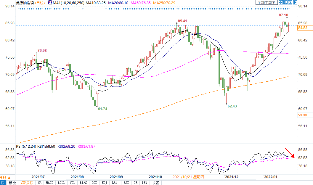 周五(1月21日)布油尾盘下跌0.58%,报收87.83美元/桶。因担忧供应紧张,本周早些时候,布伦特原油和美国原油双双升至2014年10月以来的最高水平。不过因美国原油意外增加和美股大幅下跌影响,市场出现获利了结油价承压,令本周涨幅收窄。