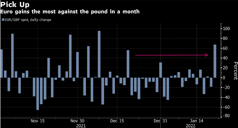 交易员此前将英镑兑欧元推高,因预期英国央行最早将在下个月再次升息,以应对通胀急升。欧元兑英镑一度创2020年2月以来新低至0.8307,但周五欧元兑英镑大幅反弹,录得近一个月最大单日涨幅。