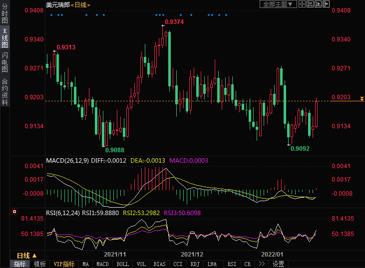 周二(1月25日)欧洲时段,美元兑瑞郎大幅攀升至近两周高位0.9200附近,欧洲股市的积极开盘影响了避险货币瑞郎。