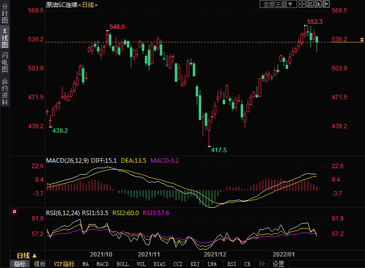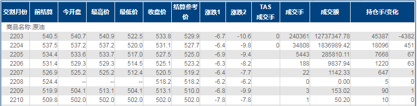 上海原油价格下跌1.24%,主力合约2203终盘收于533.8元/桶,跌6.7元/桶。