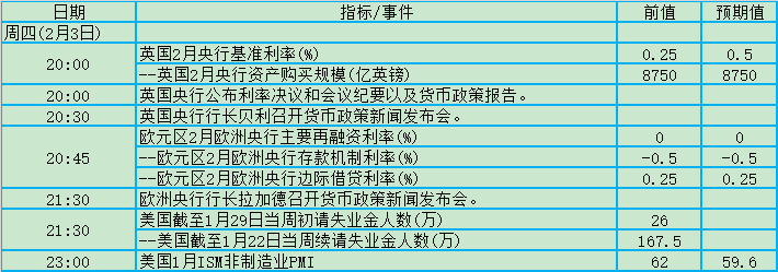 周四(2月3日)关键词:英国央行决议、欧洲央行决议、贝利、拉加德、美国ISM非制造
