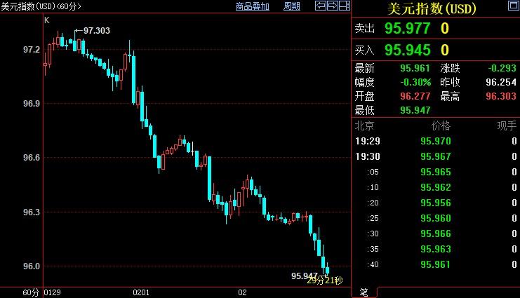 北京时间19:29,现货黄金上浮0.09%至1802.90美元/盎司;COMEX期金主力合约上浮0.11%至1803.5美元/盎司;美元指数下跌0.32%至95.962。
