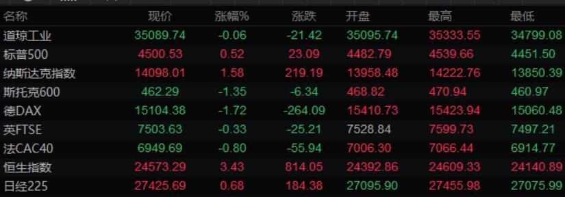 美股收盘情况:标普500指数上涨0.5%,报4500.53点;道琼斯工业平均指数下跌0.1%,报35089.74点;纳斯达克综合指数上涨1.6%,报14098.01点;纳斯达克100指数上涨1.3%,报14694.35点;罗素2000指数上涨0.6%,报2002.359点。