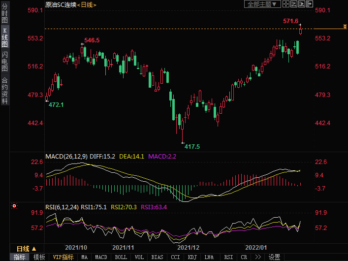 周一(2月7日)上海原油价格上涨4.52%,创逾三年新高,主力合约2203终盘收于566.9元/桶,涨24.5元/桶,投资者保持看涨情绪,预计随着需求回升,全球供应将保持紧张,不理会美国和伊朗核谈判取得进展的迹象。