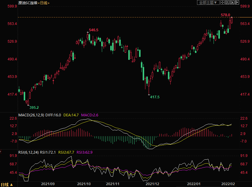 周二(2月15日)上海原油价格上涨1.94%,再创逾三年新高,主力合约2204终盘收于577.7元/桶,涨11.0元/桶,对俄罗斯可能入侵乌克兰并扰乱供应的担忧不断支撑油价走强。乌克兰总统泽连斯基表示,他听说俄罗斯可能在周三入侵乌克兰。