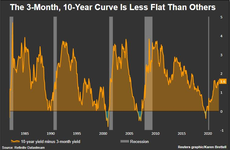 德意志银行认为,虽然该曲线持平于以前紧缩周期刚开始时的水准,但另一个经济衰退指标--三个月期国库券和10年期公债之间的利差则更令人鼓舞。