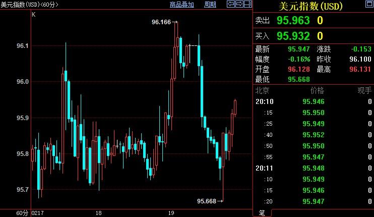 北京时间20:10,现货黄金下跌0.22%至1893.97美元/盎司;COMEX期金主力合约下跌0.20%至1896.0美元/盎司;美元指数下跌0.16%至95.949。