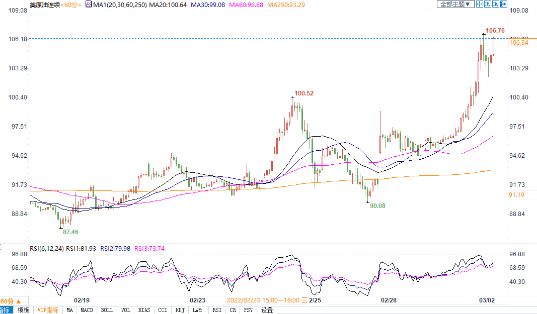 周二(3月1日)布油尾盘收涨9.4%,报收107.18美元/桶,创2014年7月以来最高。包括美国和日本在内的国际能源署(IEA)成员国同意从储备中释出6000万桶原油,以努力遏制油价的大幅上涨。然而,这一消息更加剧了市场的担忧,即供应将不足以弥补日益严重的能源干扰。此轮释放原油的规模还不及全球一天的消费量。除原油外,美国取暖油和汽油期货也触及2014年以来最高。