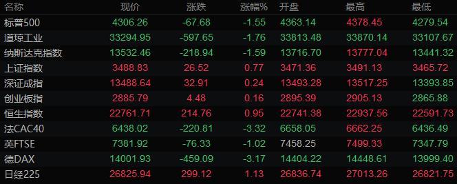美股收盘情况:标普500指数下跌1.6%,报4306.26点;道琼斯工业平均指数下跌1.8%,报33294.95点;纳斯达克综合指数下跌1.6%,报13532.46点;纳斯达克100指数下跌1.6%,报14005.99点;罗素2000指数下跌1.9%,报2008.506点。