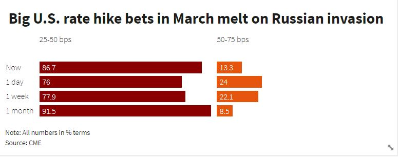 富国银行在一份研究报告中写道,“俄乌危机的近期影响似乎是在通胀方面,但对增长的打击更难看清楚,并使央行官员处于非常艰难的境地。我们预计鲍威尔主席将在他的国会证词中强烈暗示,美联储将在3月16日的会议上升息25个基点,而不是50个基点”。