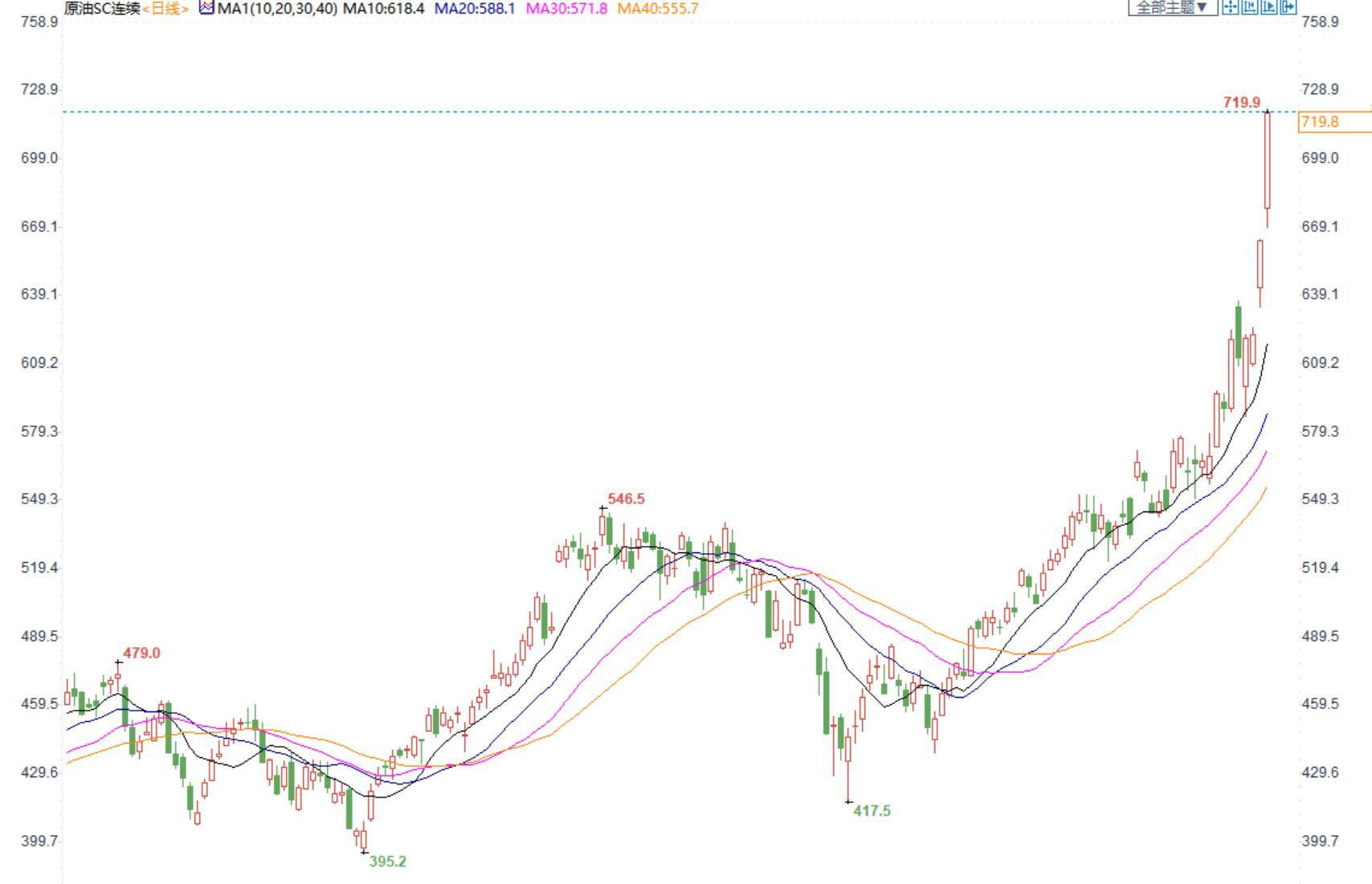 周四(3月3日)上海原油价格上涨10.98%,主力合约2204终盘收于719.8元/桶,涨71.2元/桶,地缘紧张局势升温,对俄制裁打压供给支持油价。
