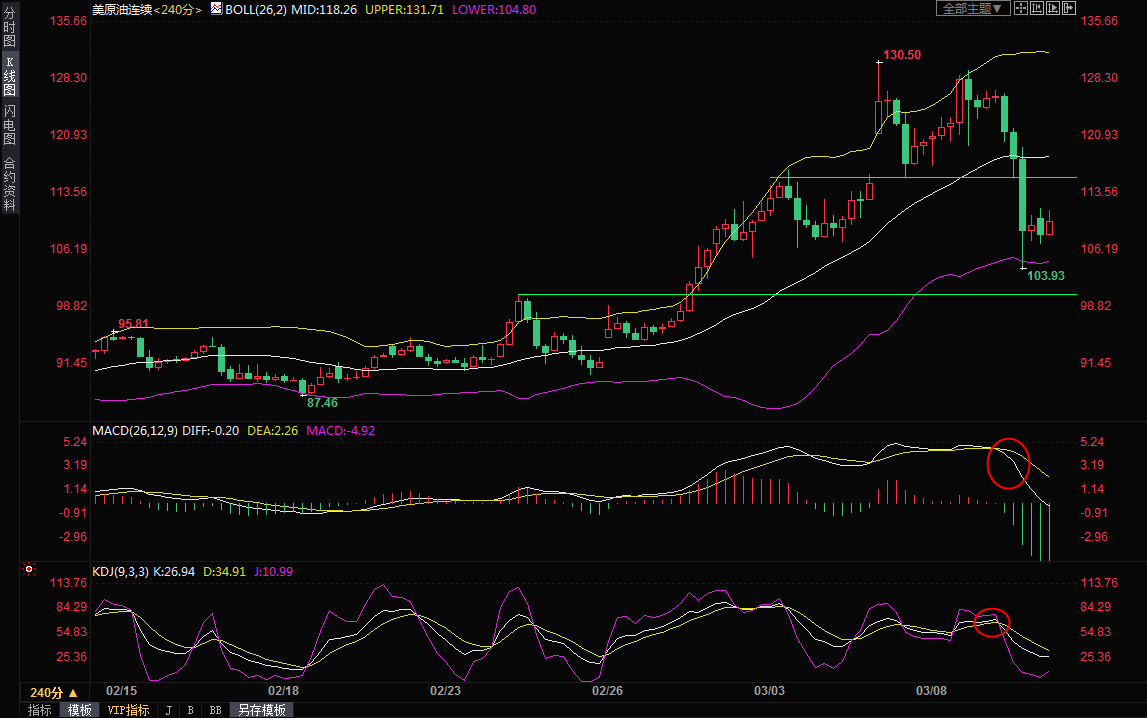 4小时级别:高位震荡;布林线初步收口后趋向水平运行,关注布林线轨道104.77-131.72区域突破情况。目前MACD和KDJ死叉信号仍在,若跌破布林线下个104.77附近支撑,则油价可能会进一步试探100.52附近支撑。