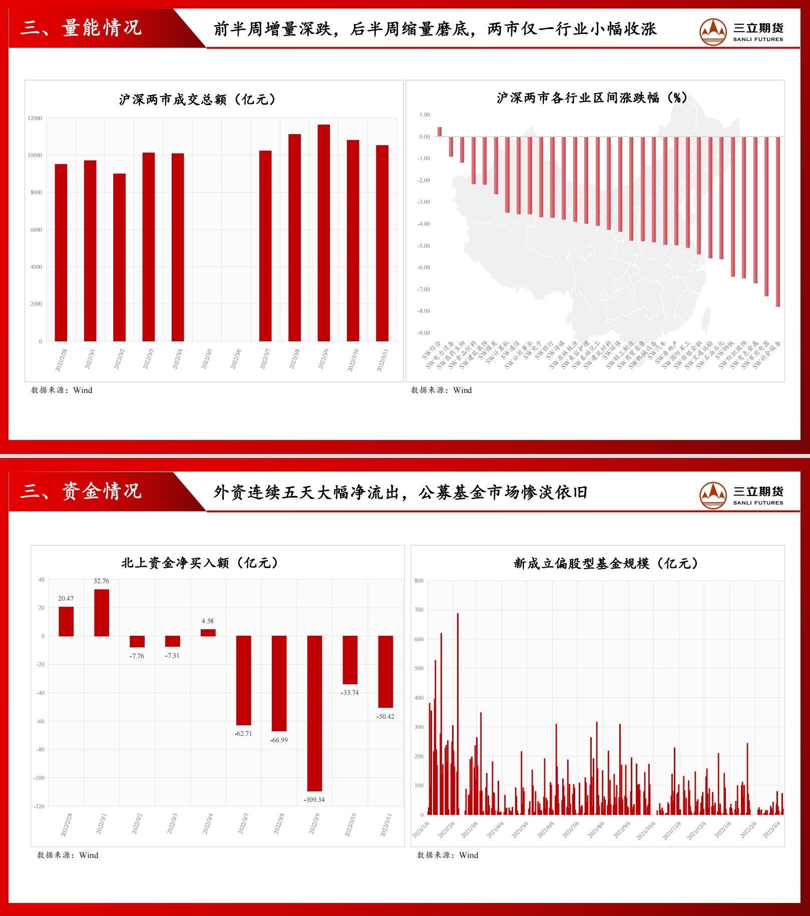 期指各标的指数的周涨跌幅分别是中证500(-4.85%)>沪深300(-4.22%)>上证50(-4.14%)。沪深两市日均成交额为10848亿元,较上周增加1175亿元。从申万一级行业周涨跌情况来看,几乎全线收跌,社会服务、家用 电器以及有色金属跌幅居前。