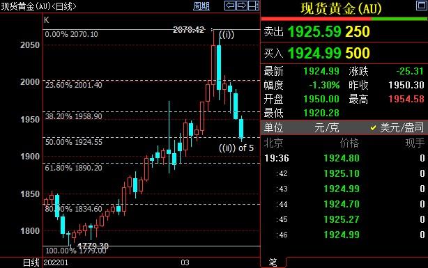 北京时间19:58,现货黄金下跌1.36%至1924.36美元/盎司;COMEX期金主力合约下跌1.74%至1926.7美元/盎司;美元指数下跌0.34%至98.792。