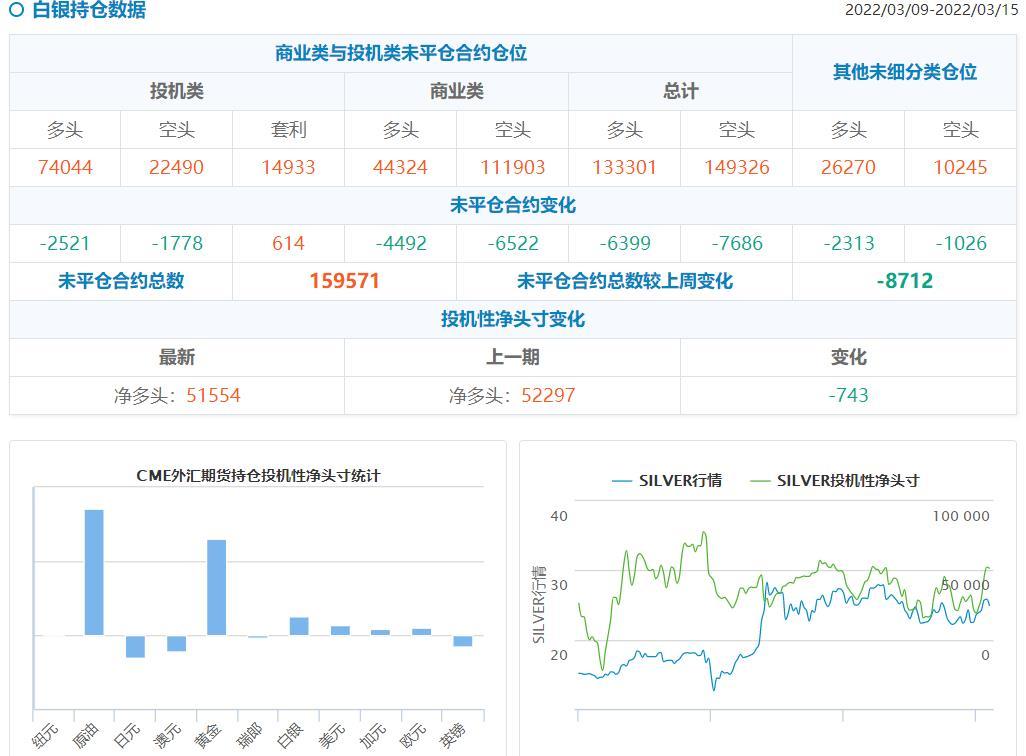 2、美国商品期货交易委员会(CFTC)数据显示,截止至3月9日至3月15日当周,投机者持有的白银投机性净多头头寸减少743手,至51554手合约,表明投资者看多白银的意愿出现降温。