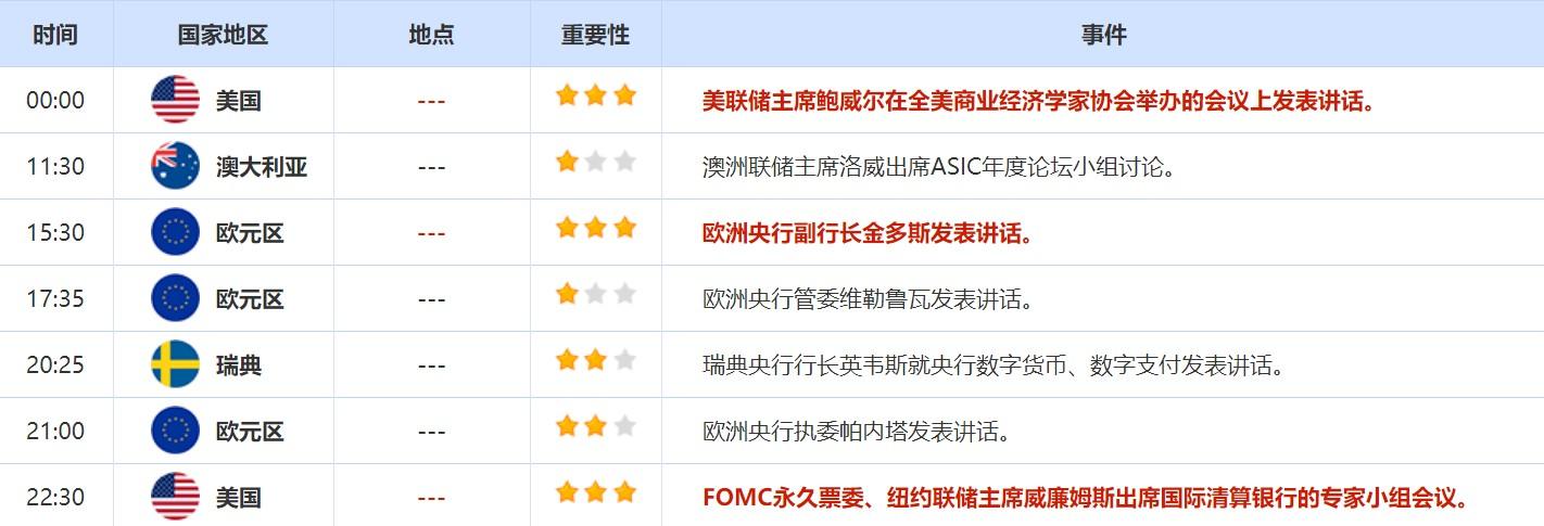 周二还需关注多位重要官员的讲话,包括美联储鲍威尔,欧洲央行副行长金多斯和纽约联储主席威廉姆斯。