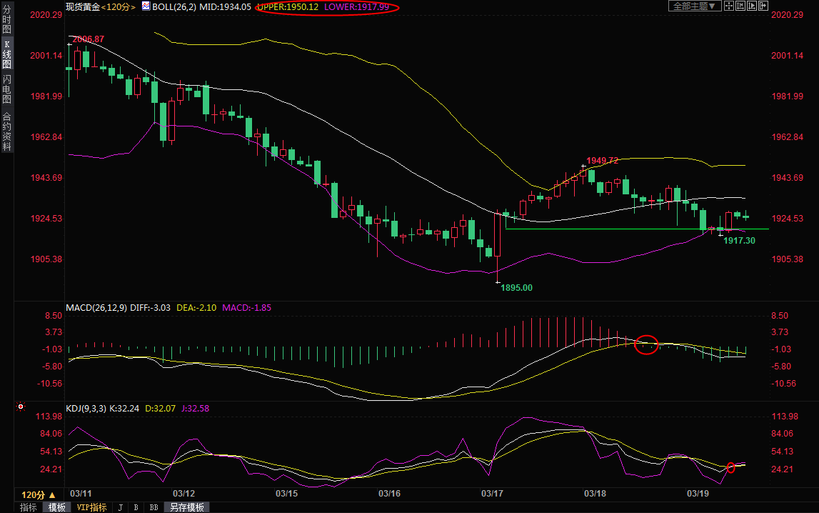 2小时级别:震荡;留意布林线轨道1919-1950区域突破情况。目前kdj轻微金叉,若能顶破布林线中轨1934.5附近阻力,则有望重新试探布林线上轨1950附近阻力。