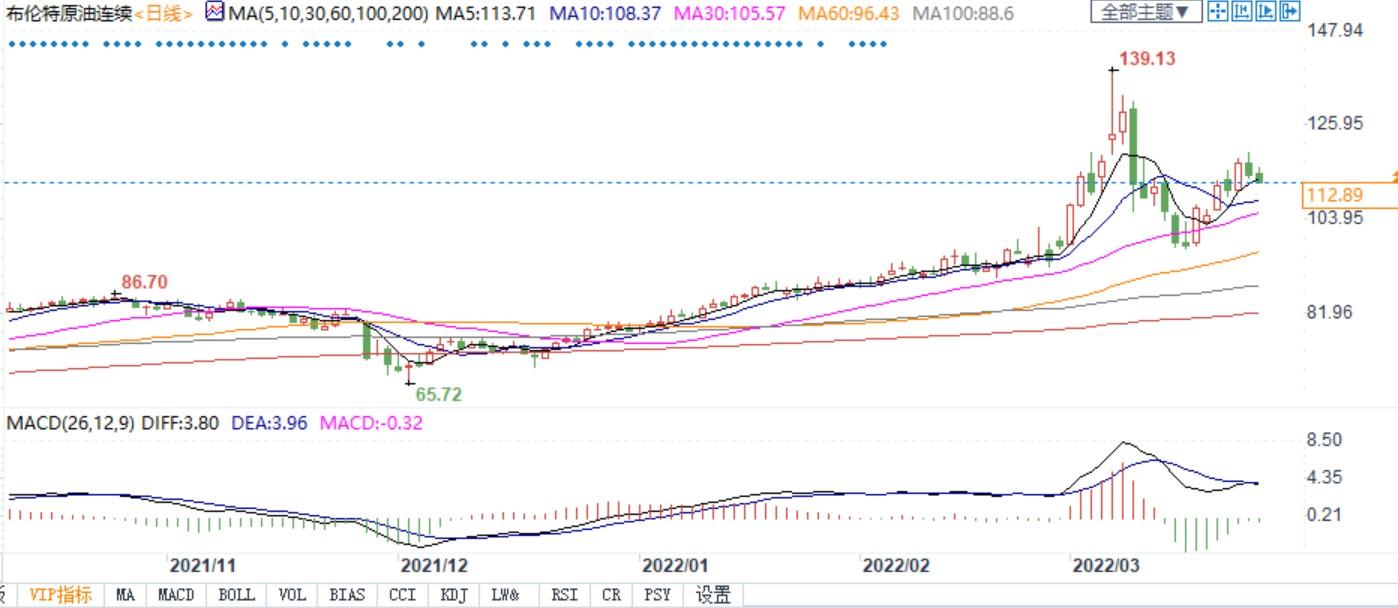 北京时间3月25日16:30,布伦特原油主力合约价格报112.95美元/桶。