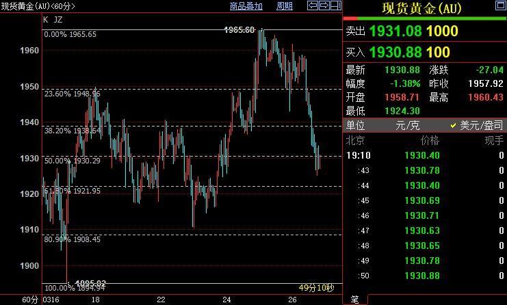 北京时间19:35,现货黄金下跌1.45%至1929.53美元/盎司;COMEX期金主力合约下跌1.30%至1928.8美元/盎司;美元指数上涨0.38%至99.165。