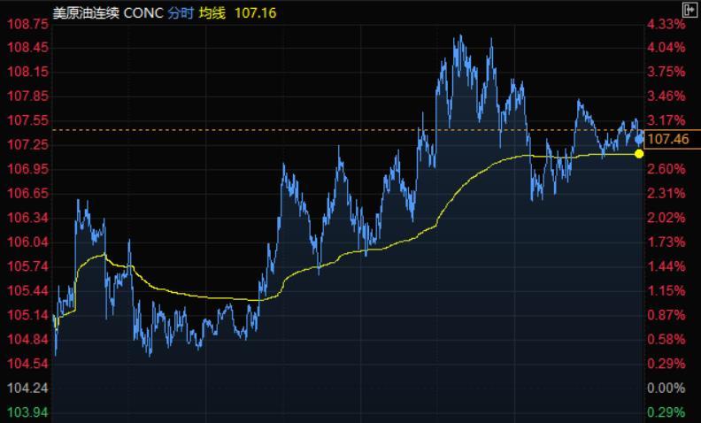 美油尾盘涨逾3%,收报107.46美元/桶,美国原油库存再次减少,表明供应紧张,且投资者担心西方对俄罗斯实施新的制裁。