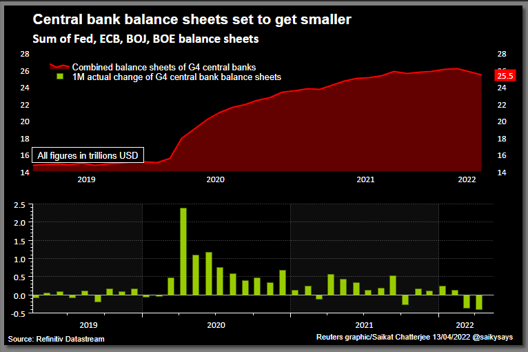 图:美欧英日央行资产负债表规模总计(上图)及月度变动额(下图)