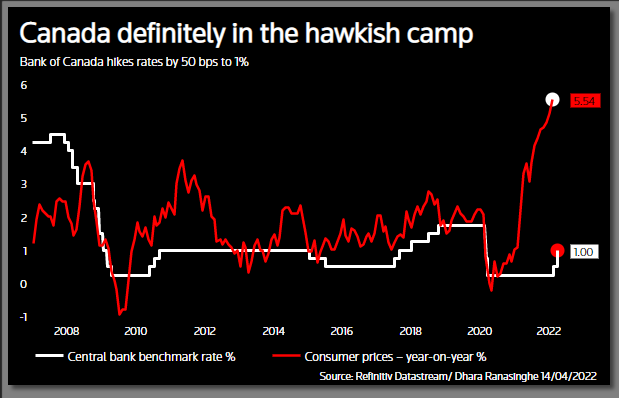 加拿大央行在3月份启动了升息周期,周三将指标利率上调50个基点至1%,为20多年来最大加息幅度。