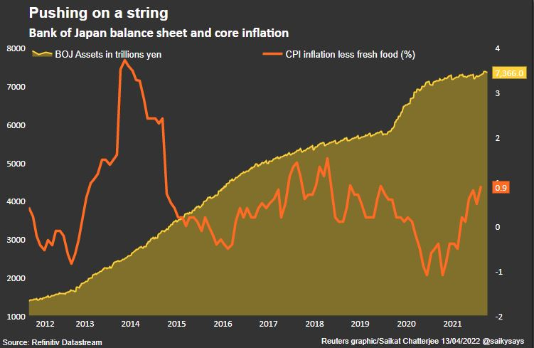 图:日本央行资产负债表规模(黄色)及日本核心CPI(橙色)