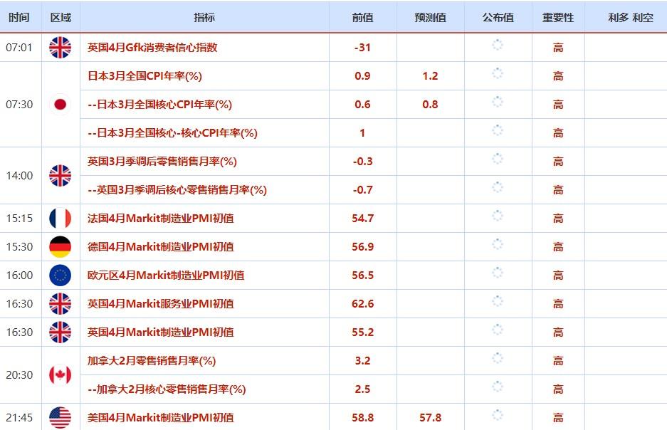 周五(4月22日)关键词:欧洲多国4月制造业PMI,英国央行行长贝利和欧洲央行行长拉加德发表讲话