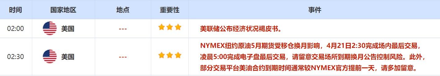 4月21日,美联储还将公布经济状况褐皮书,投资者也需对此保持关注。