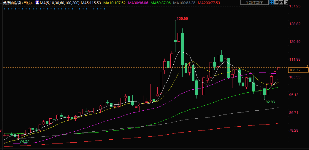 周一(4月18日)亚洲时段,美油延续涨势,现报108.26美元/桶;因周末欧盟称新一轮对俄制裁将主要针对银行和能源,乌方未能与俄方就停止在撤离路线上开火达成协议,俄乌地缘局势还存不确定性。
