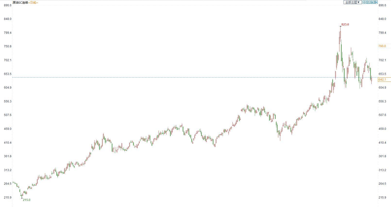 周二(4月26日)上海原油价格收盘下跌16.4元,跌幅2.49%。主力合约2206终盘收于642.1元/桶,跌16.4元/桶。油价收盘下跌,整体依然维持在震荡区间中,原油需求前景下滑给油价压力,全球疫情的担忧情绪继续升温,同时全球经济增长预期下滑,此外,美联储大幅度升息预期延续支持美元,这些因素给油价短期走势带来压力。
