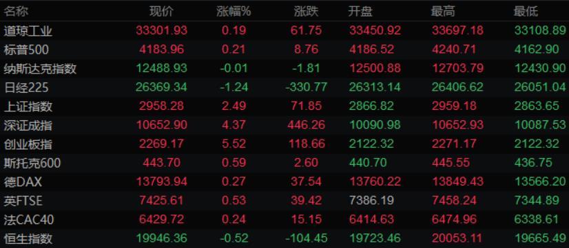美股收盘情况:道琼斯指数收盘上涨62.08点,涨幅0.19%,报33302.26点;标普500指数收盘上涨7.60点,涨幅0.18%,报4182.80点;纳斯达克综合指数收跌1.81点,跌幅0.01%,报12488.93点。