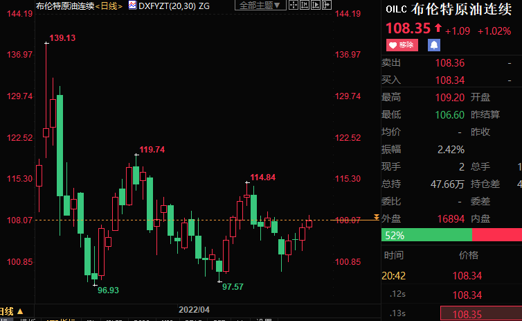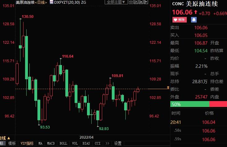 截至发稿,NYMEX原油期货上涨4.48%至106.31美元/桶;ICE布伦特原油期货上涨2.36%至108.71美元/桶。