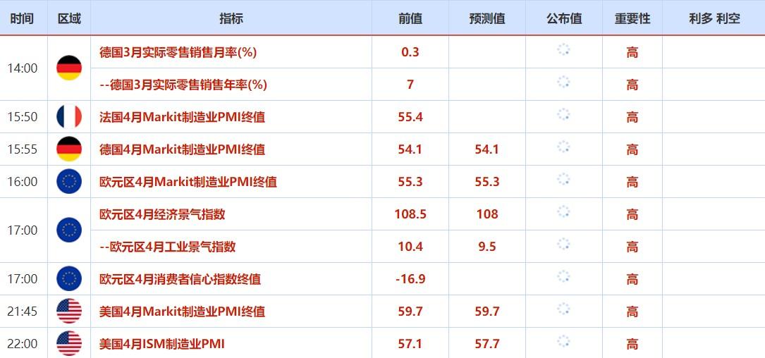 周一(5月2日)关键词:欧元区多国和美国4月Markit制造业PMI,休市公告