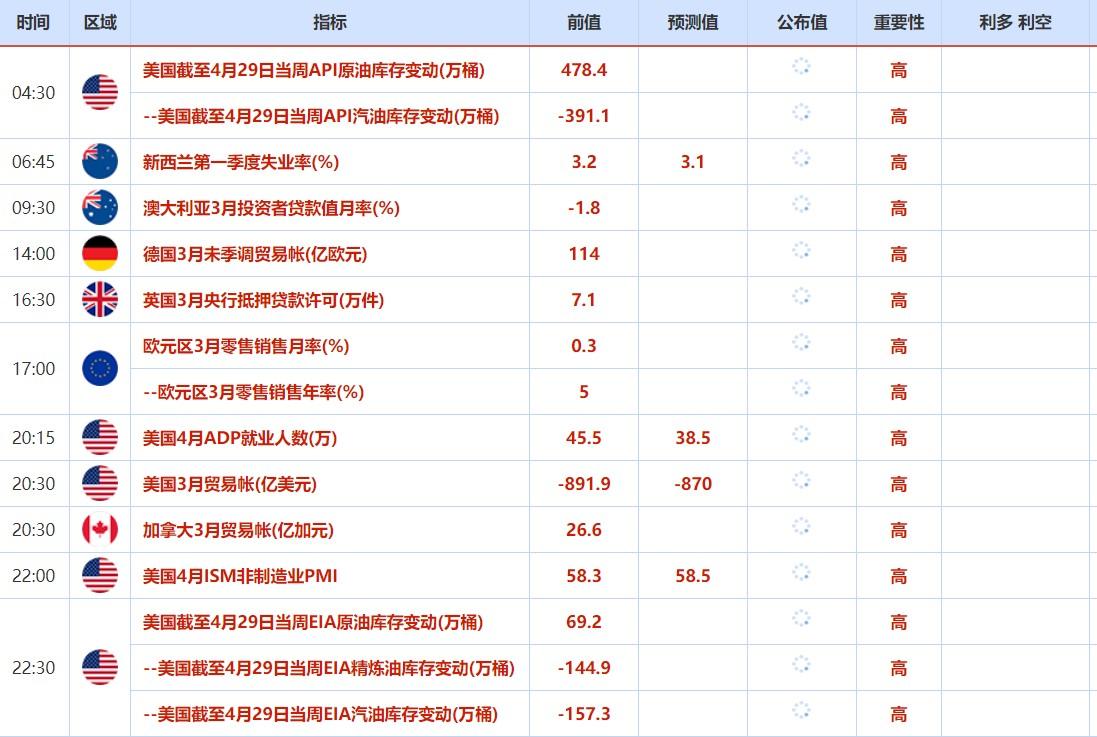 周三(5月4日)关键词:美国截至4月29日当周API和EIA原油库存变动,美国4月ADP就业人数,新西兰联储公布金融稳定报告